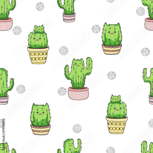 Cute Cartoon Cactus Cat Pattern Vector Seamless Background